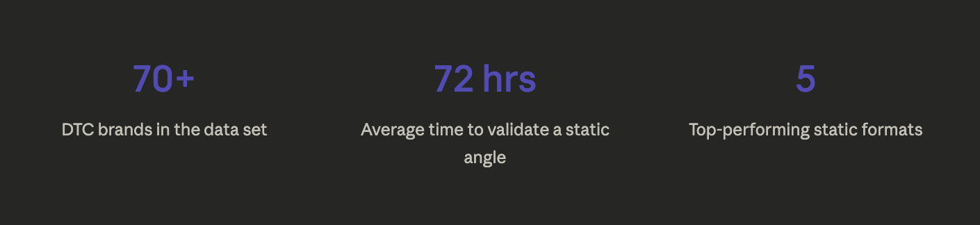 Nicht überall, aber bei einer großen Auswahl von DTC-Marken schneiden statische Anzeigen in einem erheblichen Anteil der Kampagnen durchweg besser ab als Videos. Noch wichtiger ist, dass Statik schneller und billiger zu testen ist. Es wird empfohlen, zunächst mithilfe von Statik die Blickwinkel der Botschaft zu überprüfen und dann bewährte Konzepte in die Videoproduktion umzusetzen.