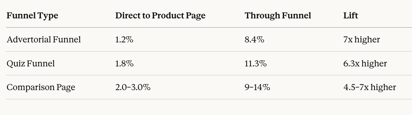 A product page gives them none of that. It gives them a price, some bullet points, and a "buy now" button. That's why the industry-standard direct-to-product-page conversion rate sits at 1.2–2%. Meanwhile, brands using the funnel stack regularly see conversion rates of 8–14%. Same traffic. Same product. Completely different destination.